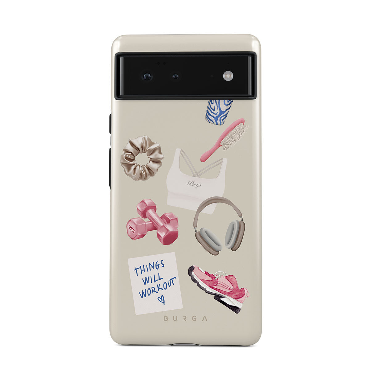 This design features: dumbbells, headphones, tumbler, hairbrush, pink trainers, sports bra, crunchie, "Things Will Work Out" sticky note