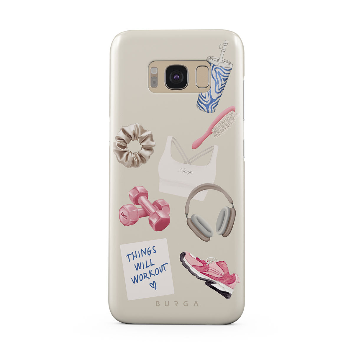 This design features: dumbbells, headphones, tumbler, hairbrush, pink trainers, sports bra, crunchie, "Things Will Work Out" sticky note