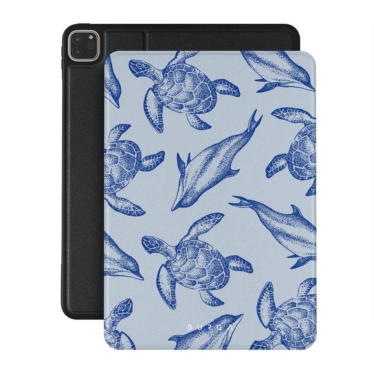 A beautiful design featuring lively turtles and dolphins playfully dancing in serene light blue water. Dive into the ocean's rhythm with our Aquatic Dance iPad Pro 11 (4th/3rd Gen) folio case.