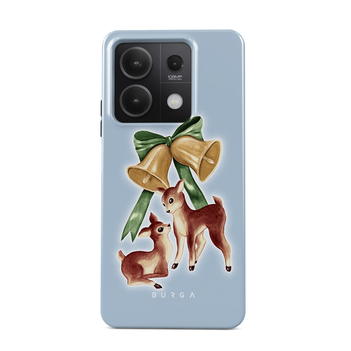 This design features: vintage reindeer, Christmas bells, golden bells, retro reindeer illustration, baby deer, light blue background