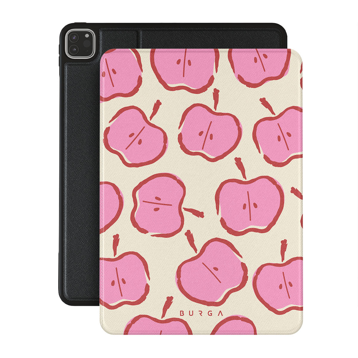 Our Bon Appétit iPad Pro 12.9 (6th/5th Gen) folio case design makes every day feel like a magical adventure filled with sweet surprises. The playful pink hues of the apples stand out brilliantly against the serene cream background, creating a captivating and enchanting visual.