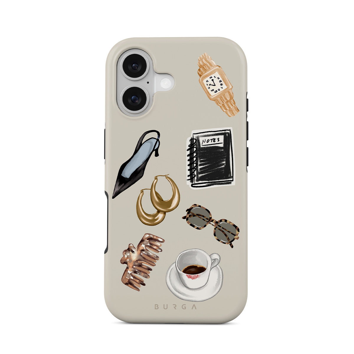 This design features: black high heel, gold hoop earrings, black notebook, coffee cup, tortoiseshell glasses, brown scrunchie, retro gold watch