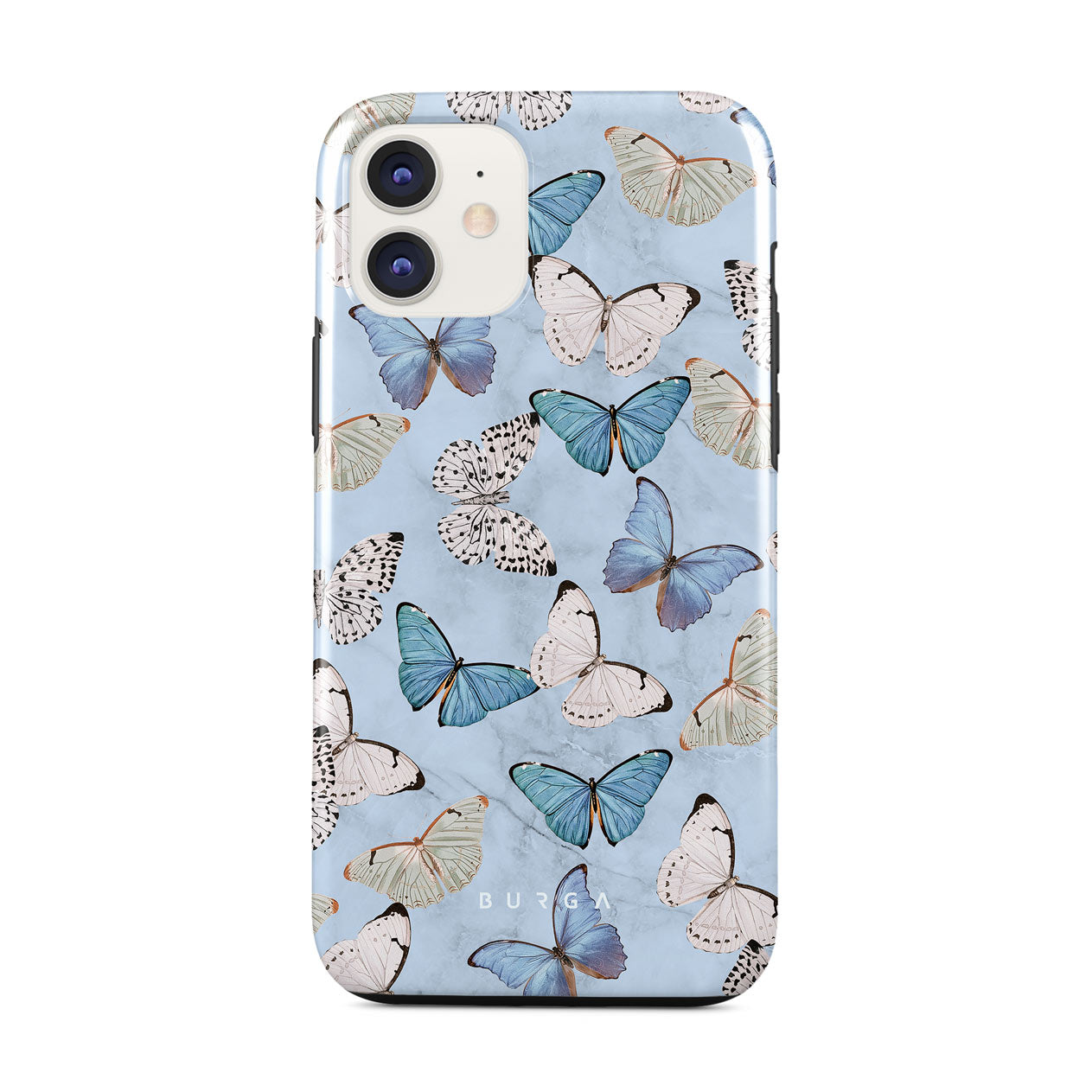 Pastel blue and a playful pattern of summery butterflies create a dreamy combination in our iPhone 11 phone case. Carry the feeling of the butterflies in your stomach while protecting your phone from any dangers, as the hard-shell case will keep it sound and safe.