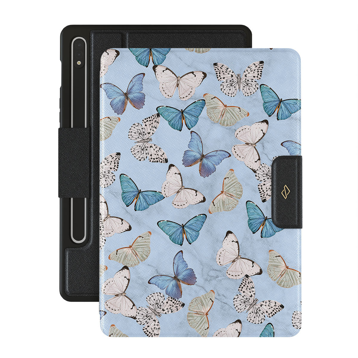 Pastel blue and a playful pattern of summery butterflies create a dreamy combination in our Samsung Galaxy Tab S9 FE folio case. Carry the feeling of the butterflies in your stomach while protecting your Galaxy Tab from any dangers, as the hard-shell case will keep it sound and safe.