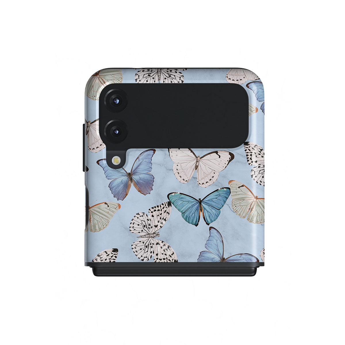 Pastel blue and a playful pattern of summery butterflies create a dreamy combination in our Samsung Galaxy Z Flip 3 phone case. Carry the feeling of the butterflies in your stomach while protecting your phone from any dangers, as the hard-shell case will keep it sound and safe.