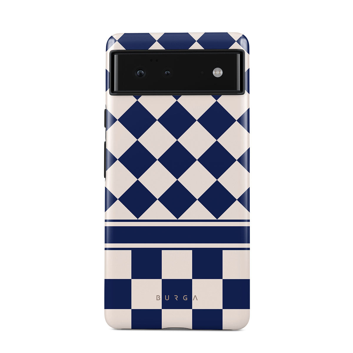 Embrace the essence of subtle luxury with our Check & Mate Google Pixel 6 phone case design. Blending eggshell and deep blue checkers, it evokes whispers of elegance. While diamonds grace the upper half, the lower half features a timeless chessboard pattern.