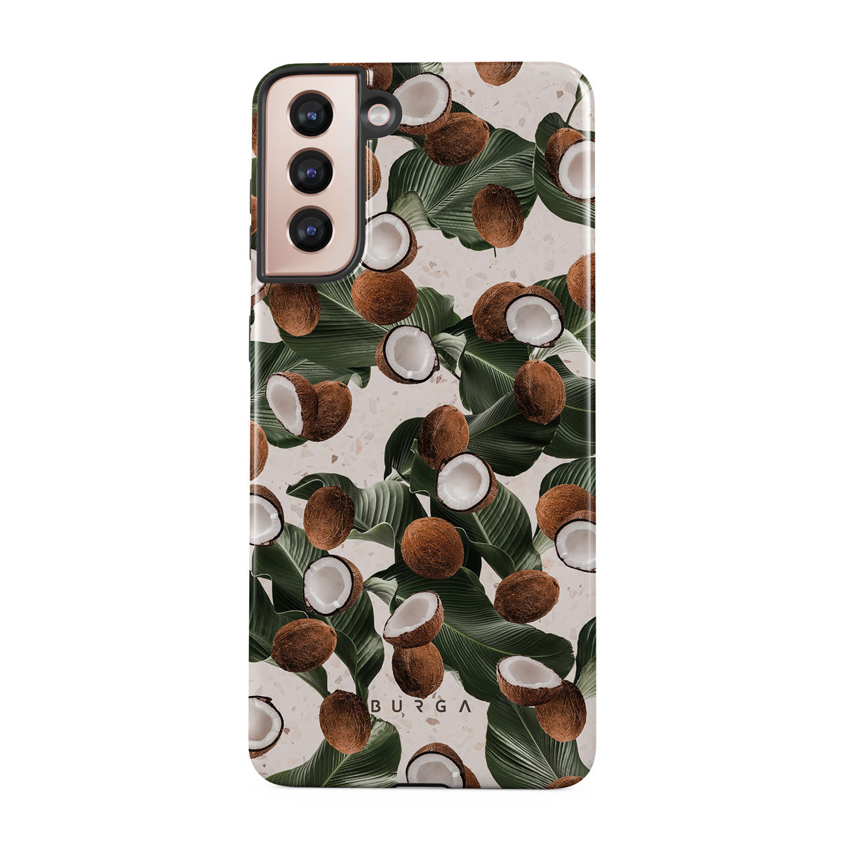 Coconut Crush Samsung Galaxy S21 Plus phone case showcases a soft creme color design with a playful addition of coconuts on top. The unexpected design duo will add a touch of tropical playfulness to your style while offering heavy-duty protection for your cell phone.