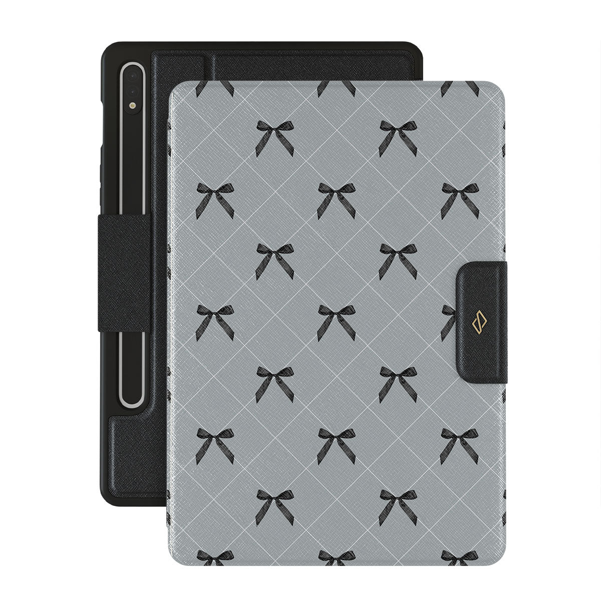 A subtle hint to a world of dance and soft melodies. Crisscrossing bows over a muted gray tone capture the flirtatious essence of the coquette-core aesthetic. Playful and sweet, our Coquette Samsung Galaxy Tab S9 FE folio case design is perfect for those who find beauty in the details.