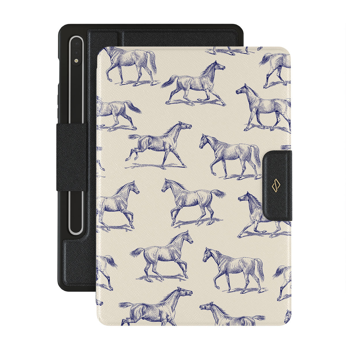 Introducing our Derby Race Samsung Galaxy Tab S9+ FE folio case design—a portrait of elegance in motion on a soft nude canvas. Engraved in delicate blue contours, galloping horses dance upon the wind, frozen in an exquisite moment of grace.