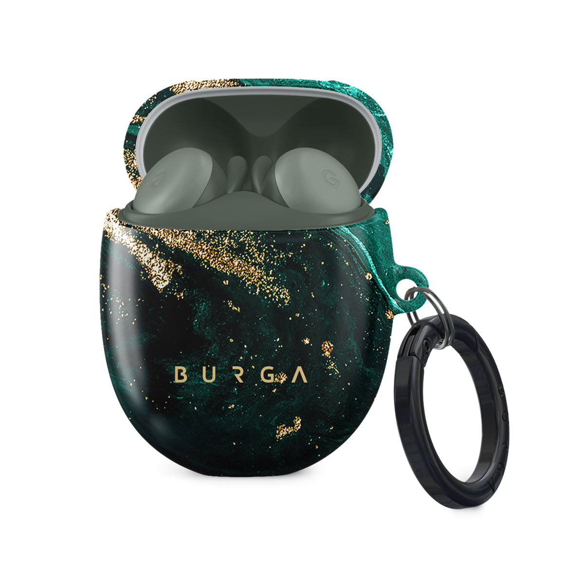 Elegant shades of green with golden sparkle create an Google Pixel Buds A case cover that radiates elegance and sophistication while protecting the case from any possible damage. Our case fits perfectly snug around Google Pixel Buds A . “Like a glove!” one might say. And it won’t disrupt the wireless charging capabilities of the newer model. There’s even an LED light indicator to prove it (don’t worry, wired charging still works, too). When fitted, the BURGA case will protect the delicate Google Pixel Buds A case beneath it from scratches, bumps, and drops while remaining scratch-free itself. Our signature design pattern prints are High Quality, and will never peel or fade away- thanks to our unique printing technology. And finally, a handy carabiner is there to make your life easier and more convenient: just snap it around your keys or belt loop and tackle the day head-on. Your music is right there by your side when you need it.