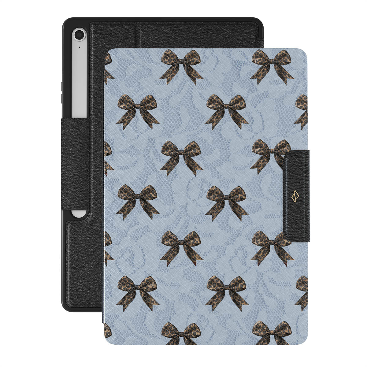 For those who command attention with subtle elegance, our Fashionista Samsung Galaxy Tab S10+ FE folio case design is your go-to. A soft blue background, accented by dark grey bows and subtle lace patterns, exudes polished, effortless style. It's quiet confidence with a hint of charm.