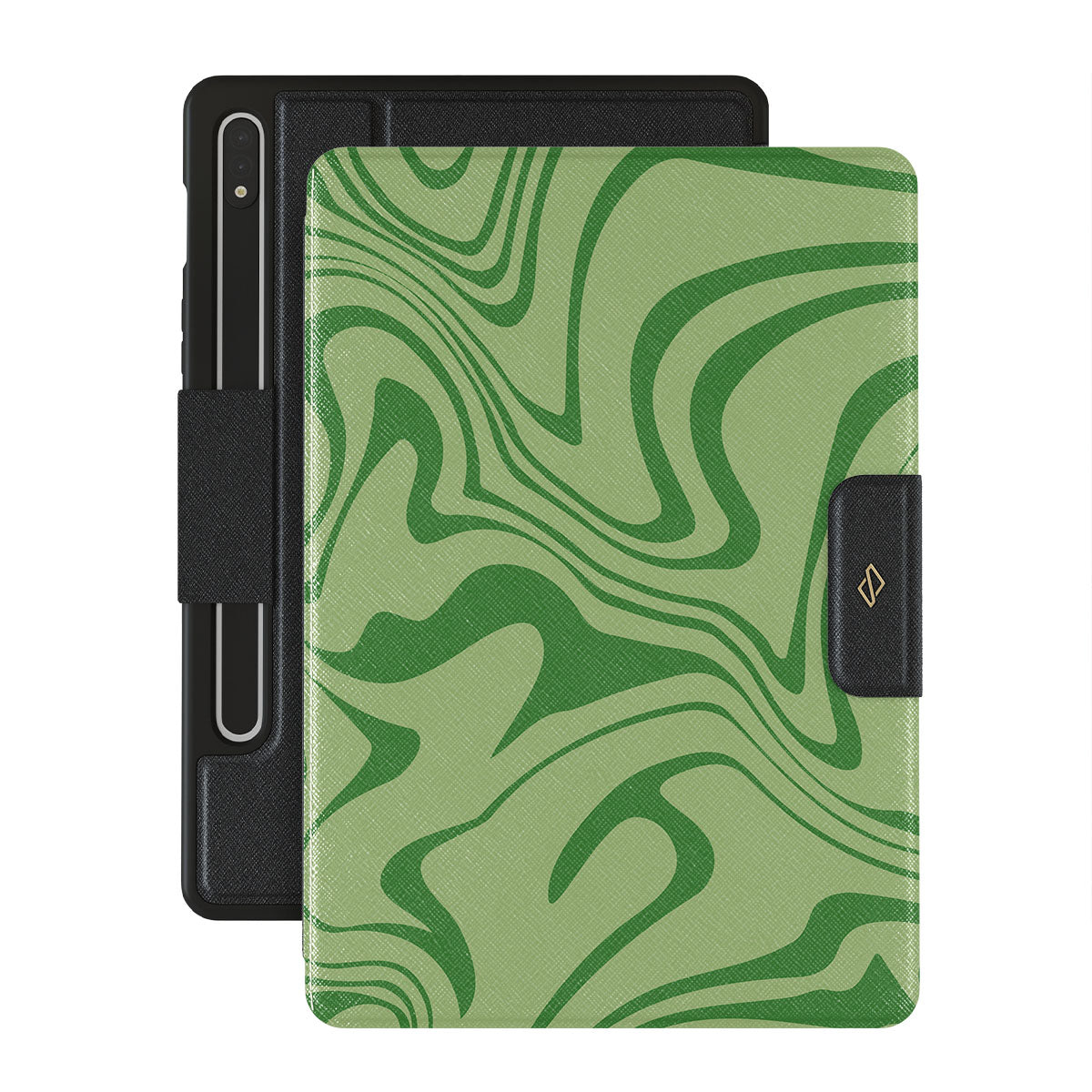 Our Funky Sensation Samsung Galaxy Tab S8+/S7+/S7 FE folio case design is a perfect abstract piece for those who love soft pastel colors but still want to stand out. A sharper take on the liquid swirl design in green shades will accompany your device perfectly.