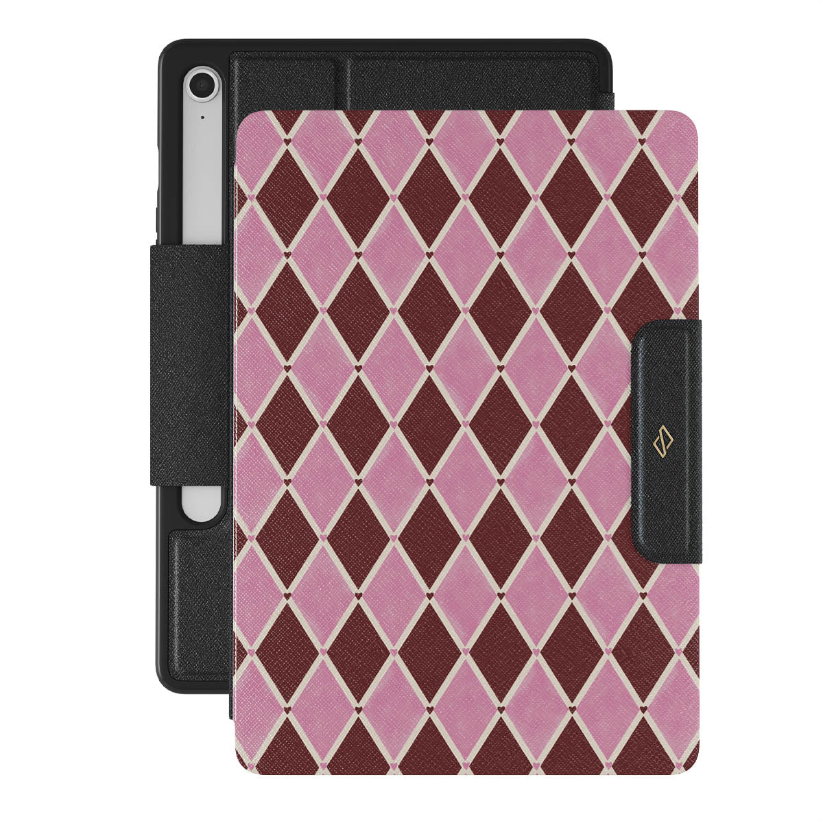 This design features: harlequin pattern, pink diamonds, deep red background