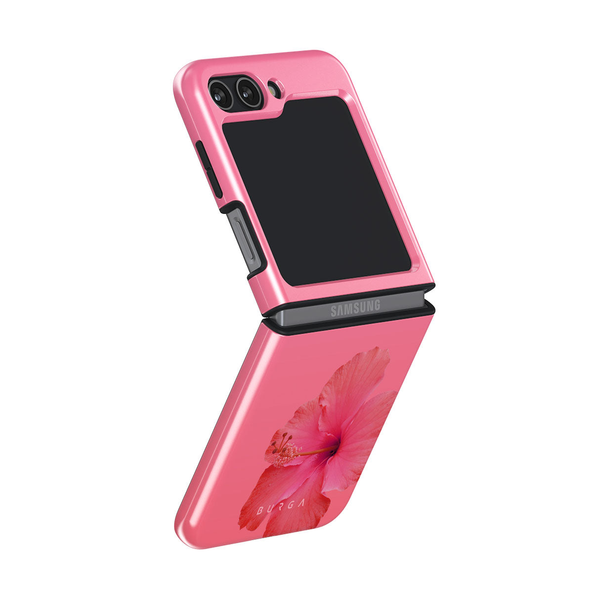 Our Island Girl Samsung Galaxy Z Flip 5 phone case design bursts with the fiery red of a hibiscus in full bloom against a dreamy pink backdrop. Perfect for those who embody the spirit of a sun-kissed island retreat.