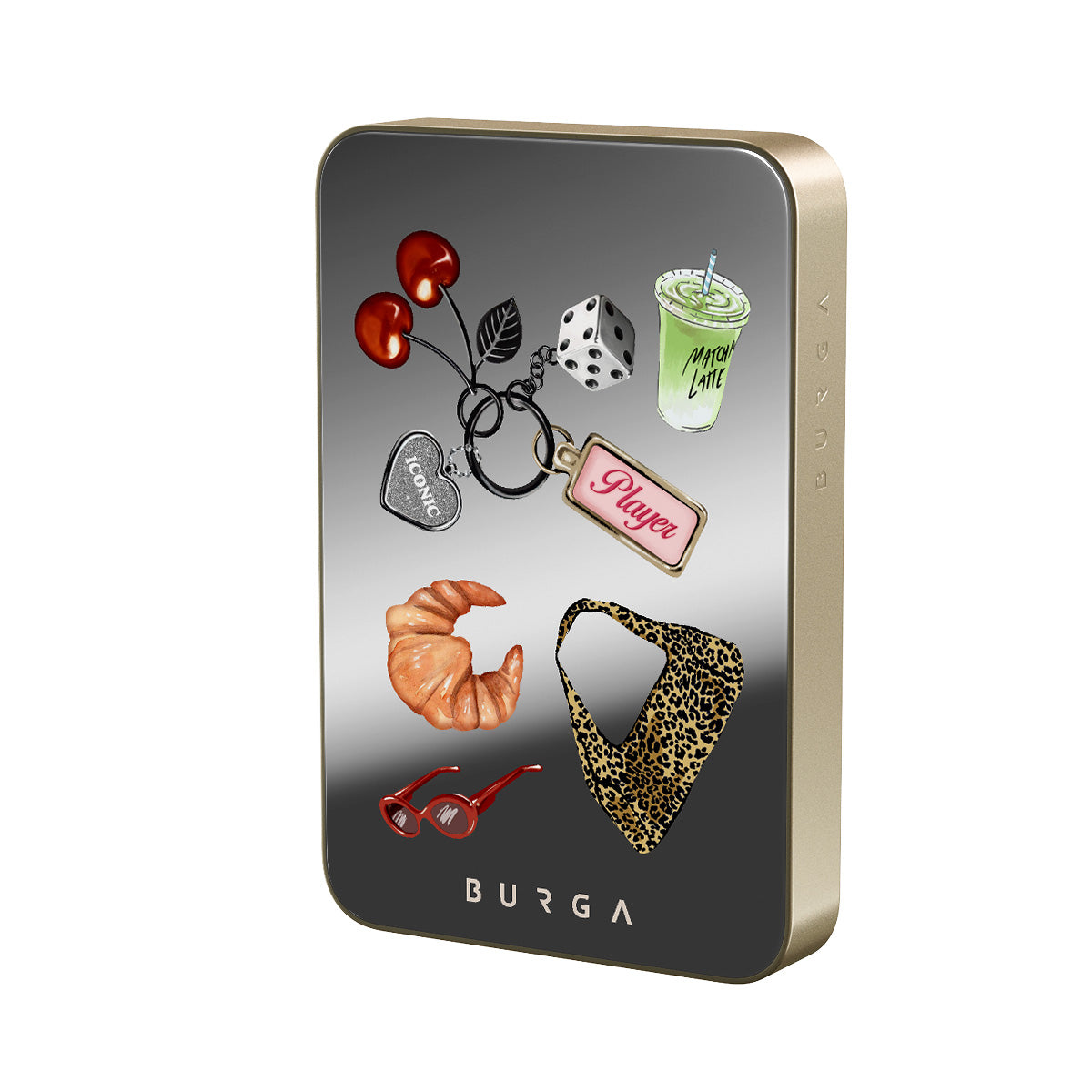 This design features: red sunglasses, red lipstick, green matcha drink, croissant, black dice, leopard-print bag, keychain with silver heart, cherries, dice and "Player" tag