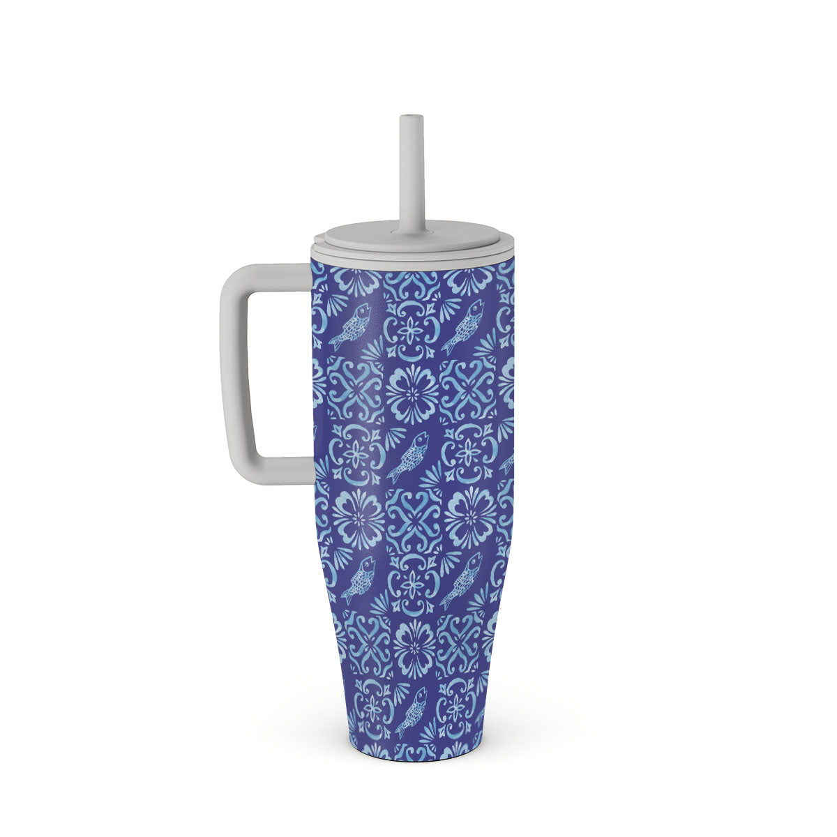 This design features: Portuguese tile patterns, deep blues, floral patterns, flowers, fish