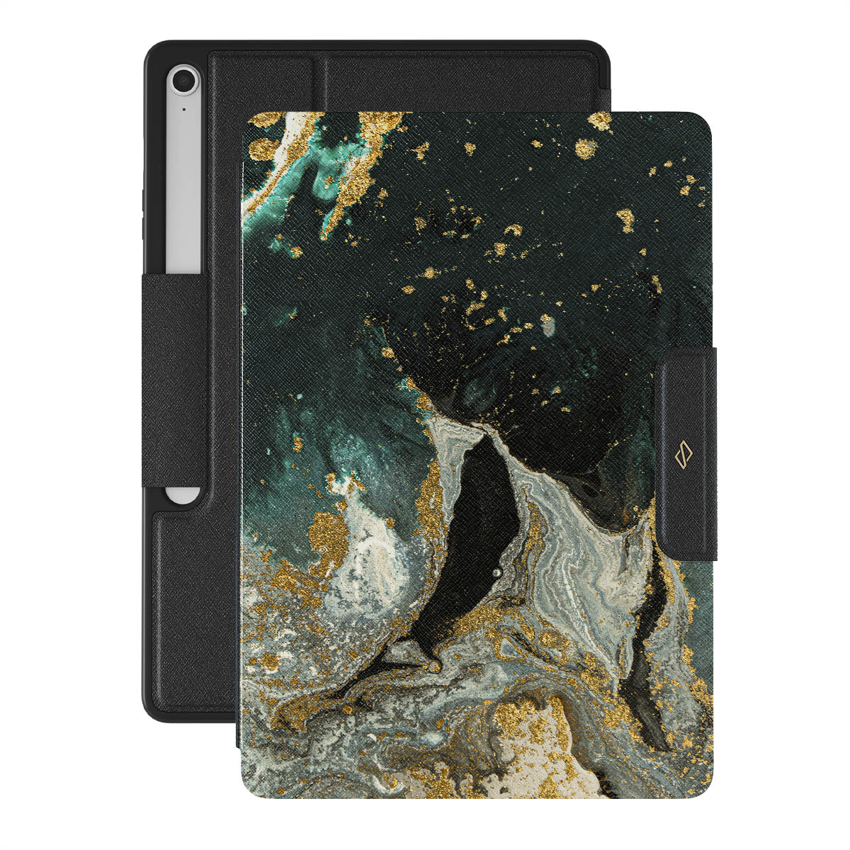 Our cute marble Northern Lights Samsung Galaxy Tab S10+ FE folio case showcases a combination of moss green shades in a marble pattern enriched with golden specks. The asymmetrical design reminding of a star map will add a touch of luxury and mystery to every accessory lover's collection.
