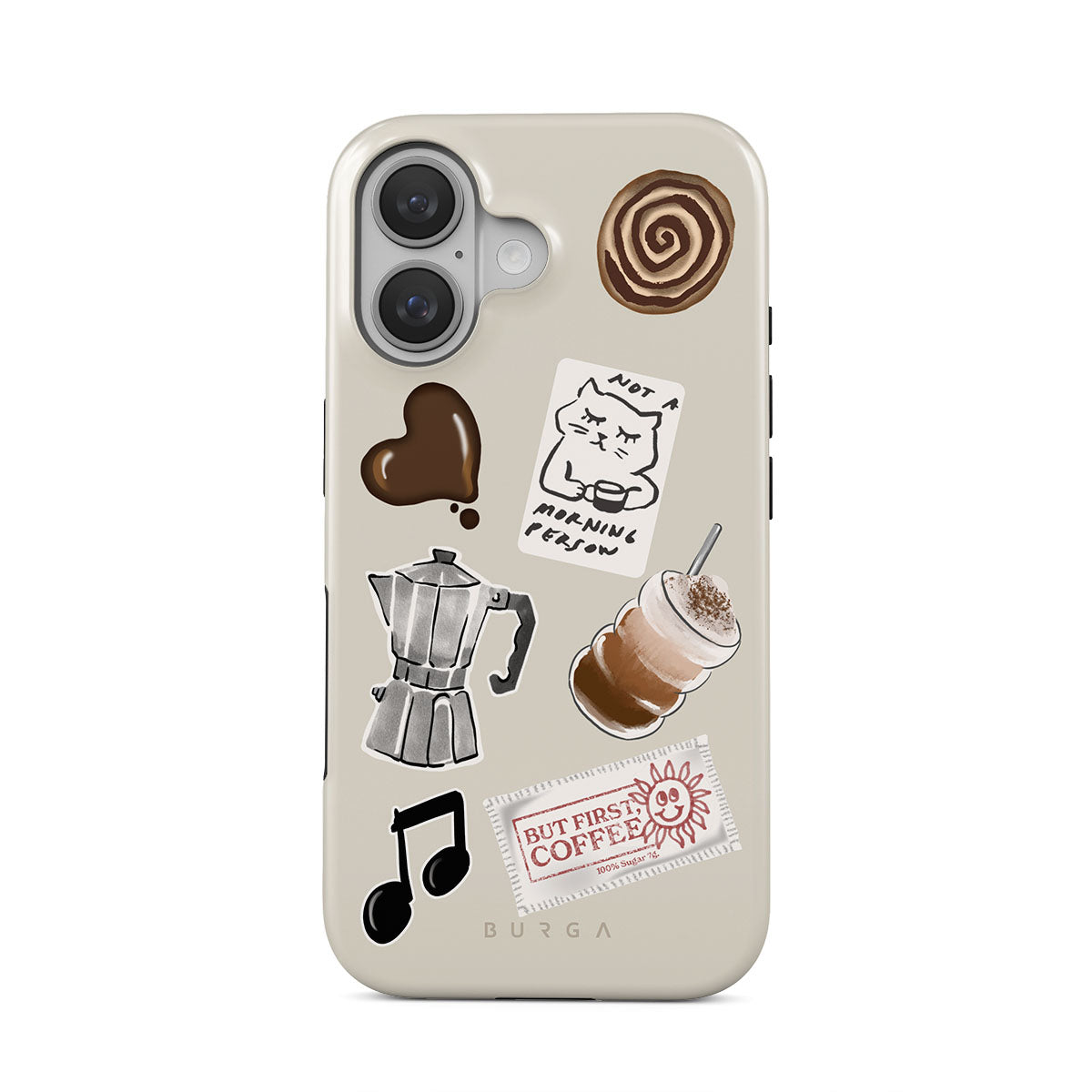 This design features: moka pot, frappe, cinnamon roll, chocolate heart, "Not a morning person" sticker, "But First, Coffee" receipt, music note