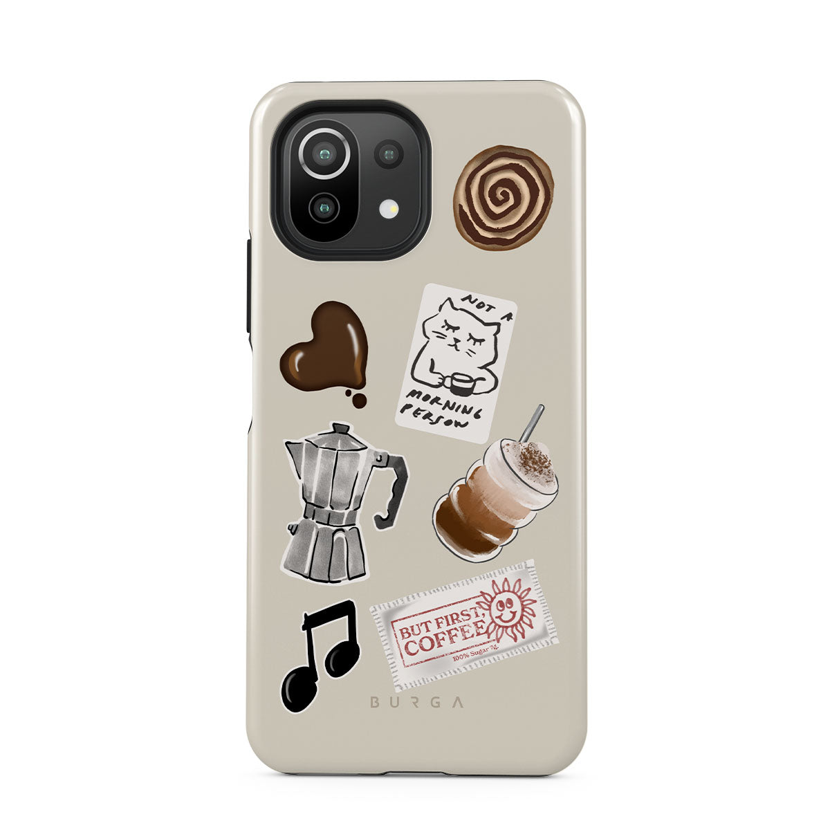 This design features: moka pot, frappe, cinnamon roll, chocolate heart, "Not a morning person" sticker, "But First, Coffee" receipt, music note