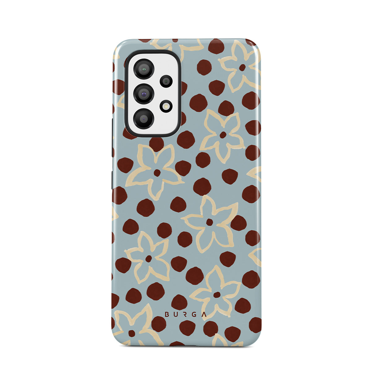 The Frutaria Samsung Galaxy A73 phone case design design: retro surf motel wallpaper meets vintage ceramics. The soft florals, earthy dots, and cool-toned palette give major “forgotten seaside town in the ‘70s” energy.