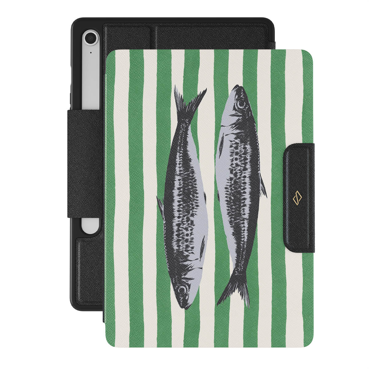 This design features: Sardines, green stripes, ocean motifs