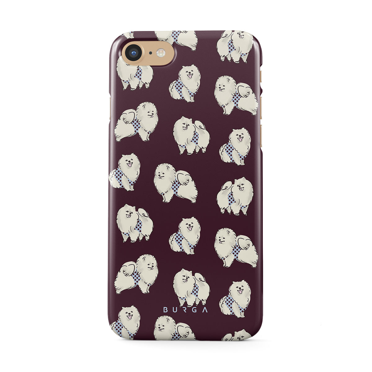 This design features: white fluffy dogs on a deep burgundy background, poodles, pets.