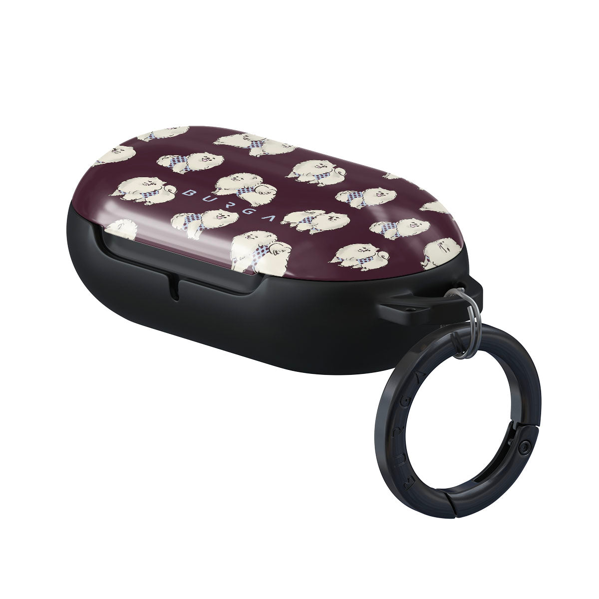 This design features: white fluffy dogs on a deep burgundy background, poodles, pets.