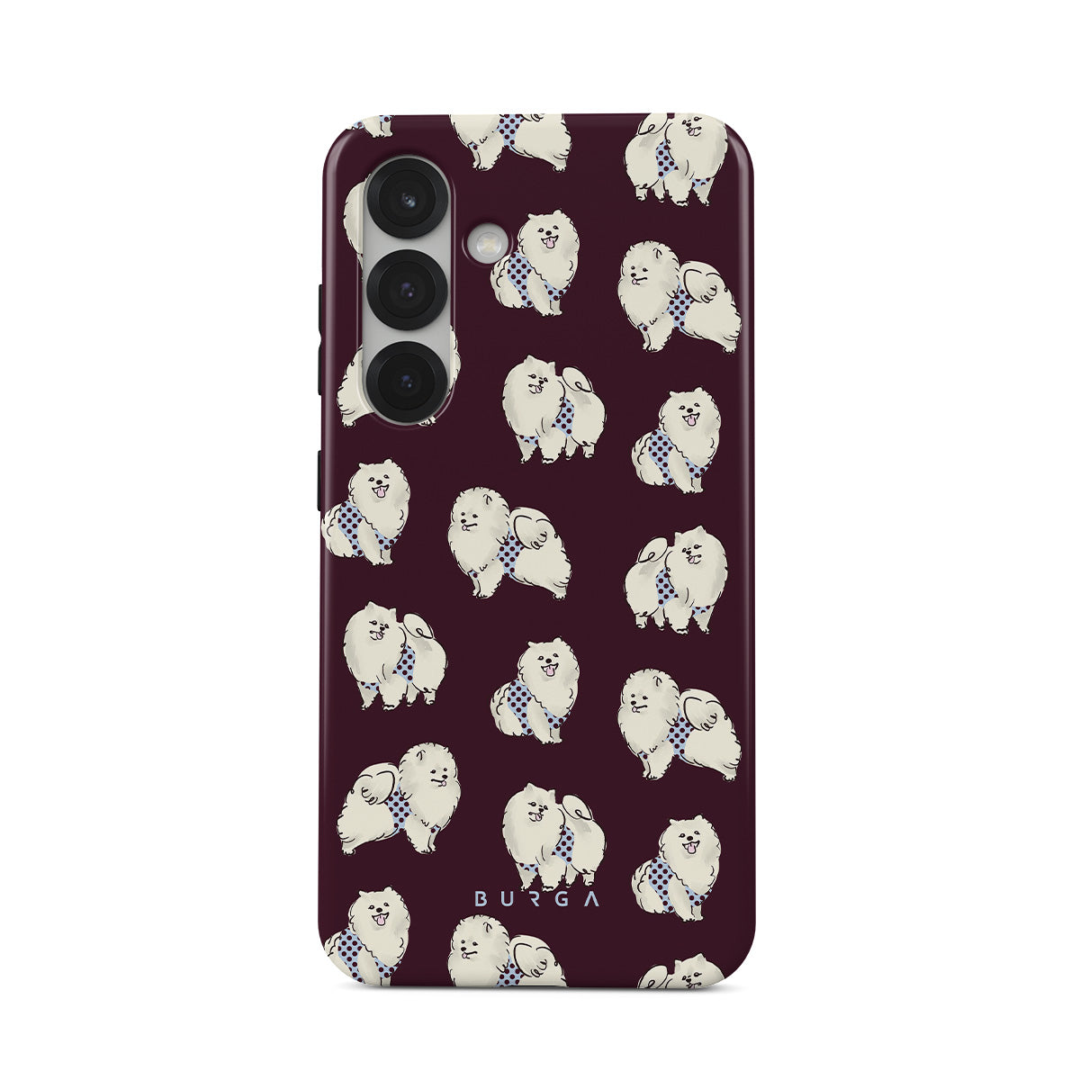 This design features: white fluffy dogs on a deep burgundy background, poodles, pets.