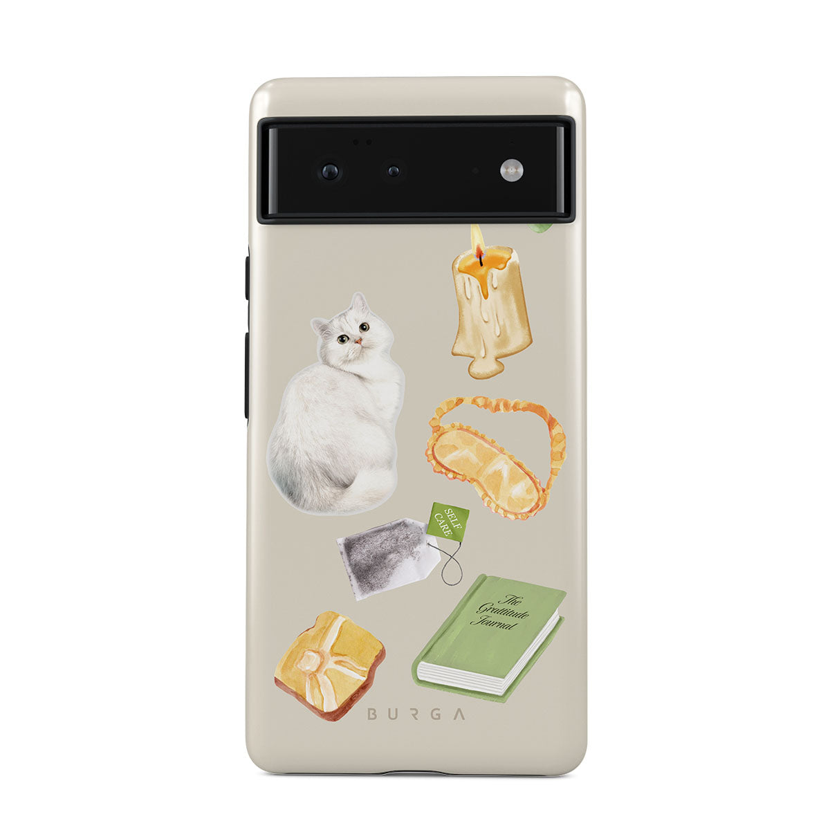 This design features: white cat, green book, candle, Gua Sha bar, sleeping mask, tea bag, yellow crystal
