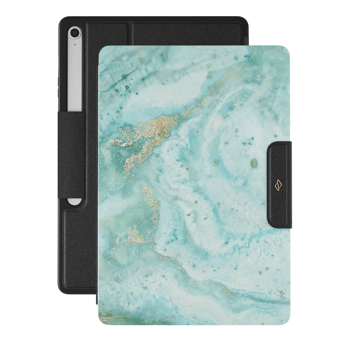 Our Uluwatu Waves Samsung Galaxy Tab S10+ FE folio case is an absolute teal dream. This Galaxy Tab cover features timeless and soft blue marble pattern enriched with golden color specks will surely remind you of a tropical beach teal waters while becoming a protective best friend for your cell Galaxy Tab.