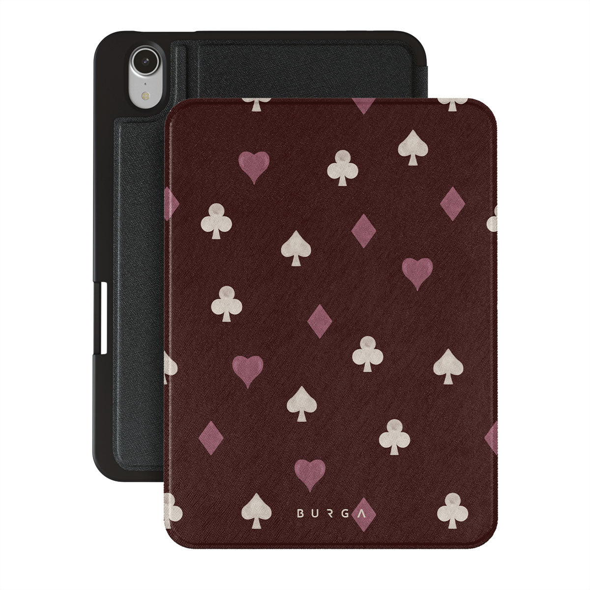 Nothing is as it appears. Hearts, clubs, diamonds, and spades—stacked in your favor or playing against you? This iPad Mini 8.3 (A17 Pro/6th Gen) folio case design features a rich burgundy background and minimalist suits that make for a game where the rules are constantly shifting.