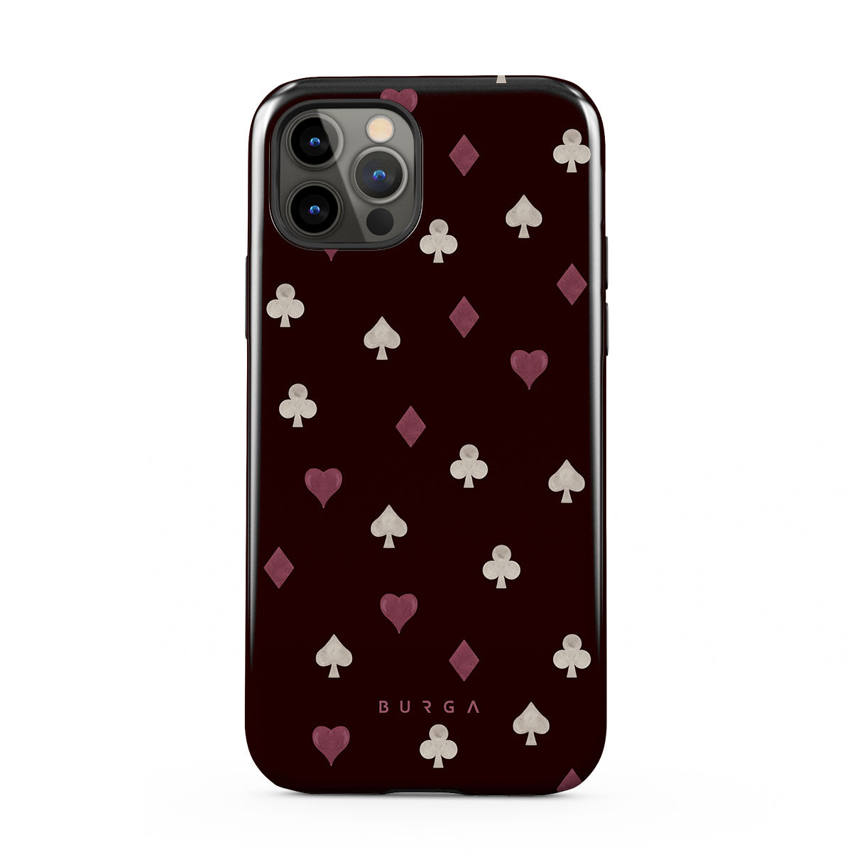 Nothing is as it appears. Hearts, clubs, diamonds, and spades—stacked in your favor or playing against you? This iPhone 12 Pro phone case design features a rich burgundy background and minimalist suits that make for a game where the rules are constantly shifting.