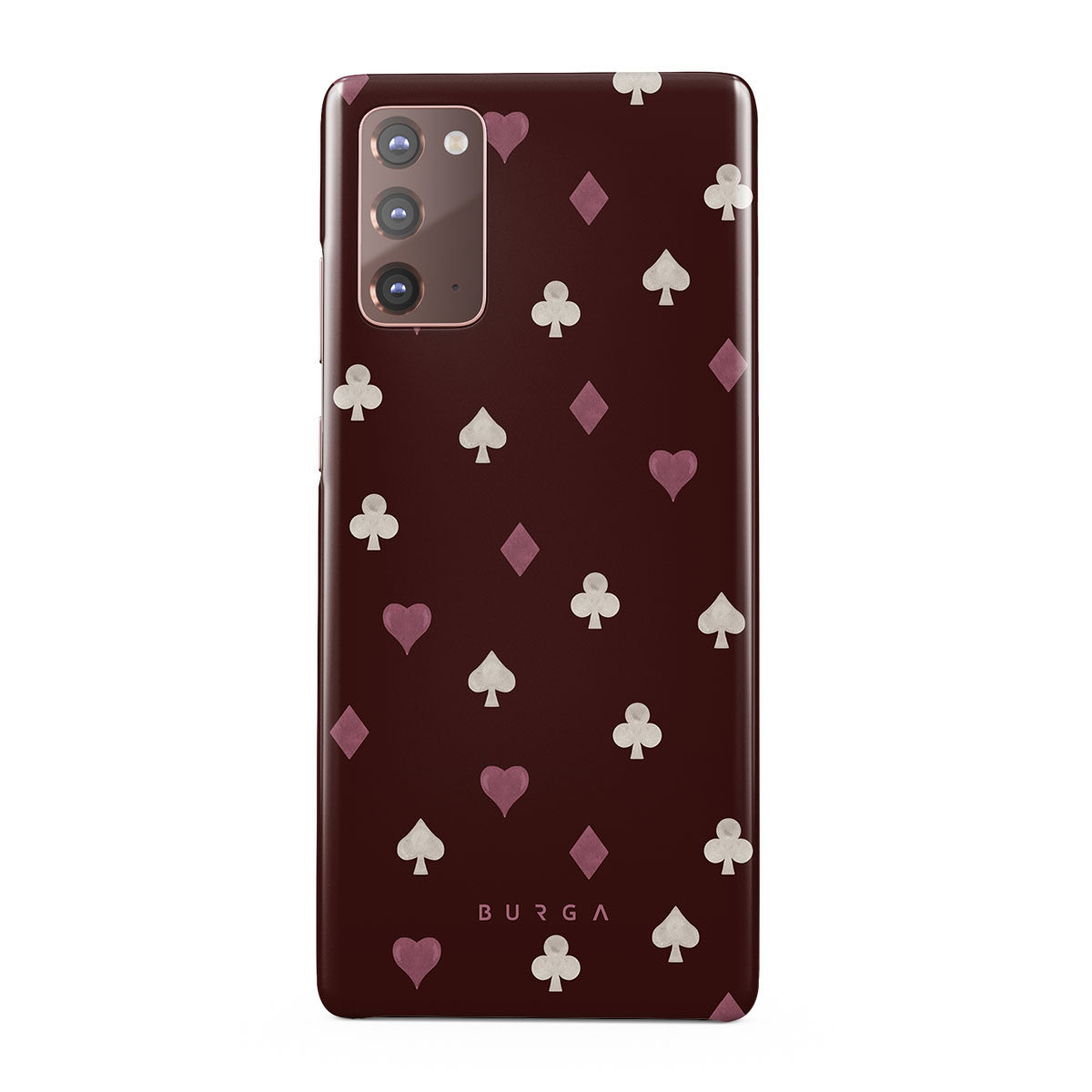 Nothing is as it appears. Hearts, clubs, diamonds, and spades—stacked in your favor or playing against you? This Samsung Galaxy Note 20 4G / 5G phone case design features a rich burgundy background and minimalist suits that make for a game where the rules are constantly shifting.
