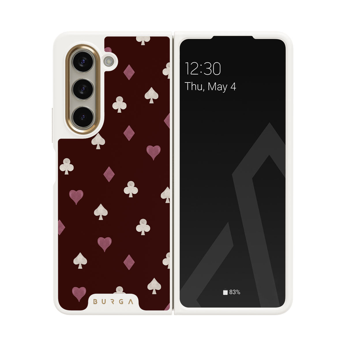 Nothing is as it appears. Hearts, clubs, diamonds, and spades—stacked in your favor or playing against you? This Samsung Galaxy Z Fold 5 phone case design features a rich burgundy background and minimalist suits that make for a game where the rules are constantly shifting.