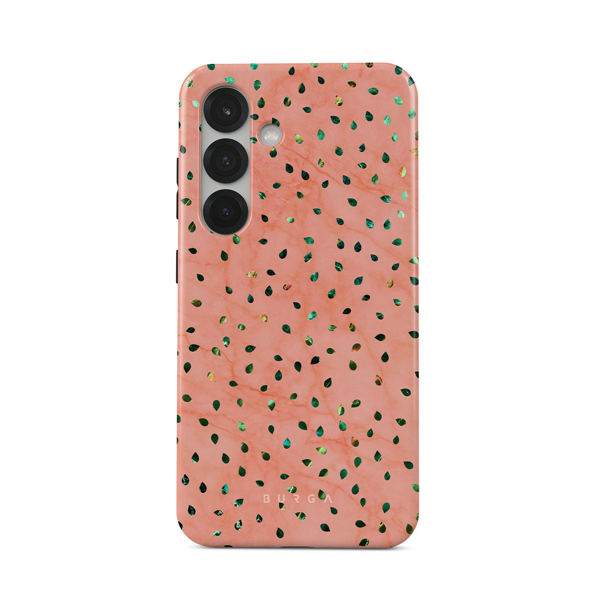 The Watermelon Shake Samsung Galaxy S25 Plus phone case offers a playful take on design merging. The watermelon seed-like specks showcase striking tropical design fragments that add a splash of color to the fresh and breezy coral pink marble. This way, the funny protective phone cover becomes a perfect statement piece for your summer outfits.