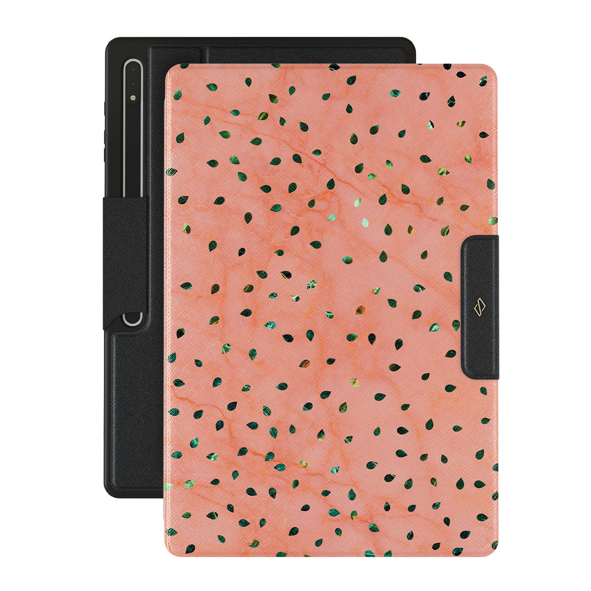 The Watermelon Shake Samsung Galaxy Tab S8 Ultra folio case offers a playful take on design merging. The watermelon seed-like specks showcase striking tropical design fragments that add a splash of color to the fresh and breezy coral pink marble. This way, the funny protective Galaxy Tab cover becomes a perfect statement piece for your summer outfits.
