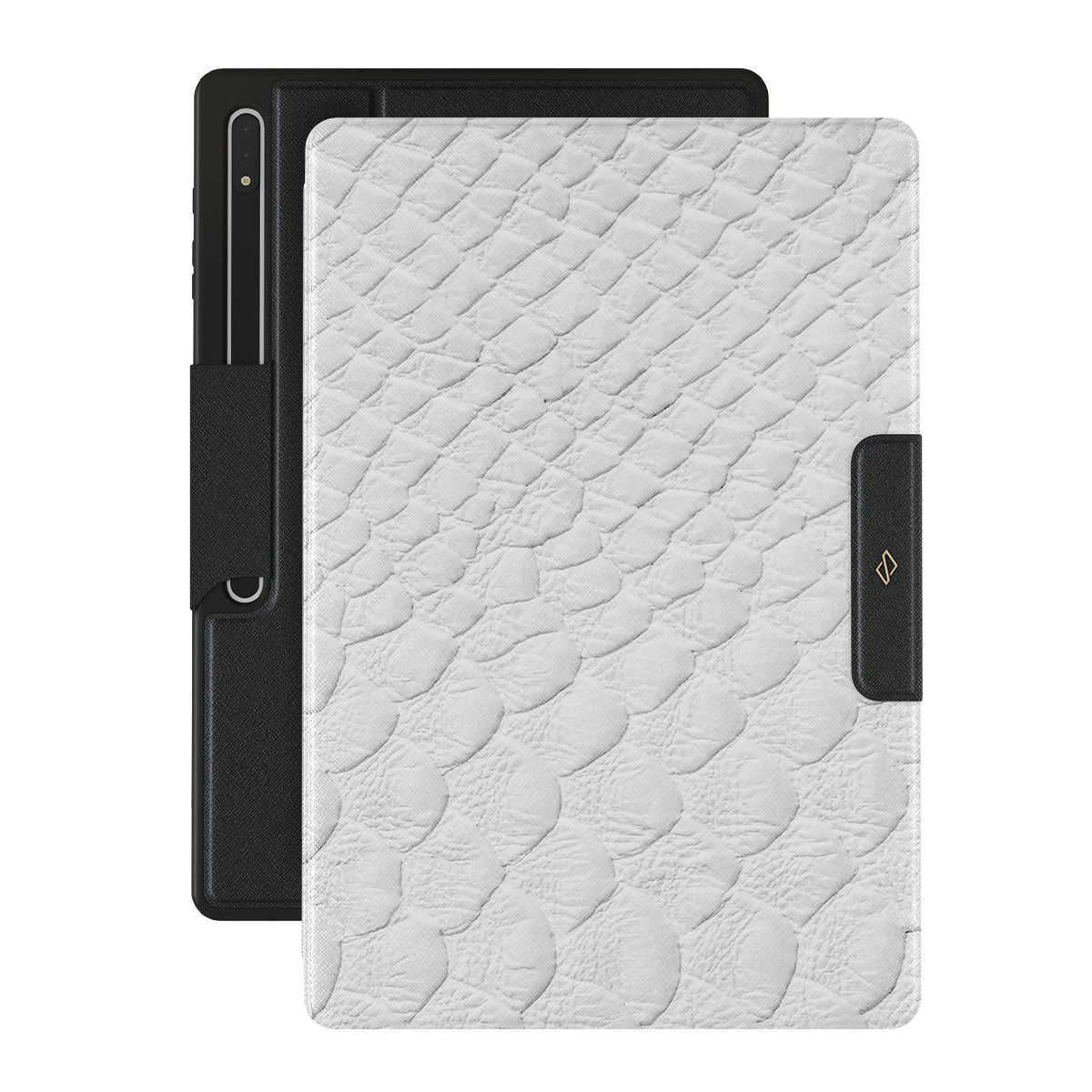 Glacial Desert Samsung Galaxy Tab S10 Ultra folio case features snakeskin design in glacial white color. The dangerous animal print will add confidence and a touch of luxury to your style while transforming your Galaxy Tab into a fashion accessory.
