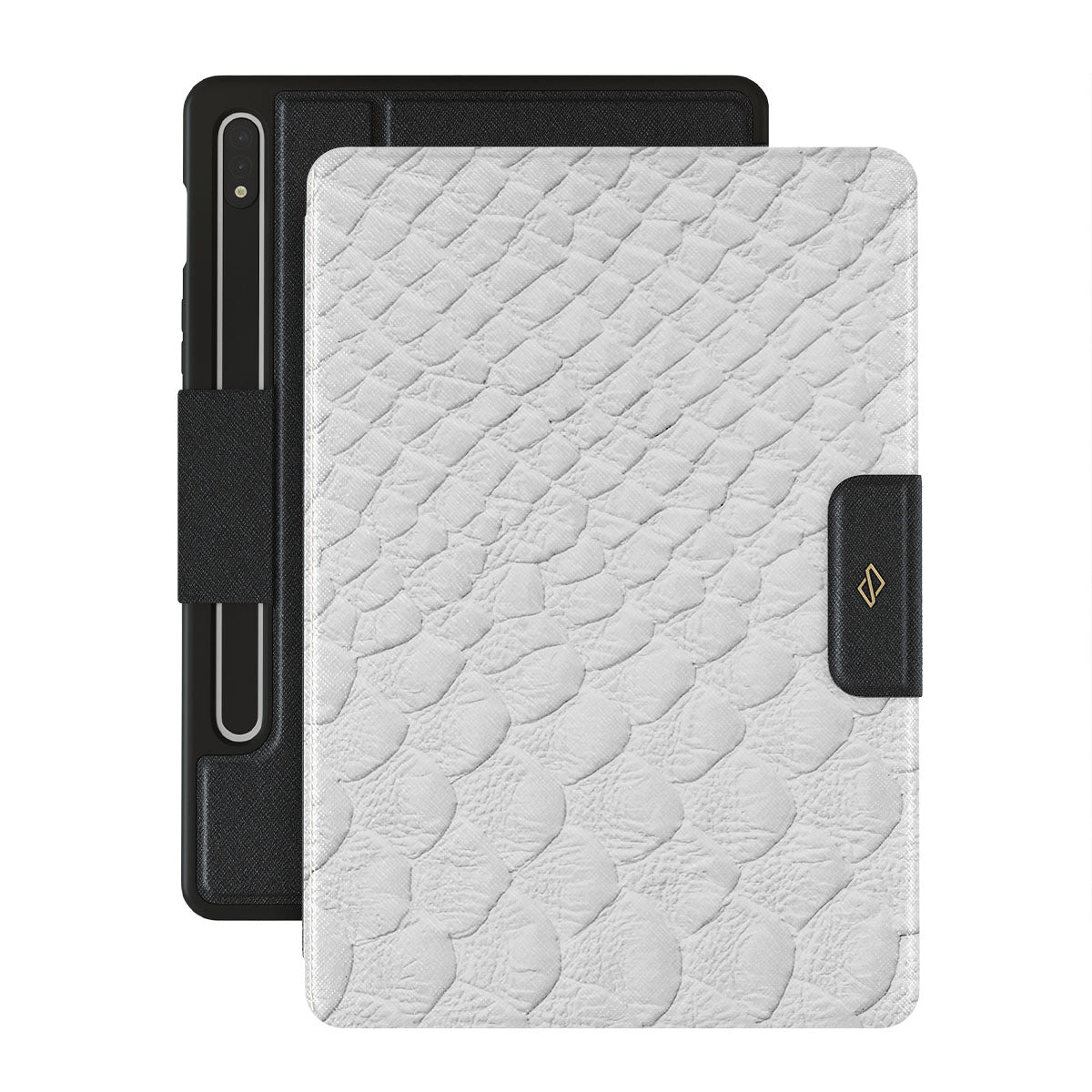 Glacial Desert Samsung Galaxy Tab S9 FE folio case features snakeskin design in glacial white color. The dangerous animal print will add confidence and a touch of luxury to your style while transforming your Galaxy Tab into a fashion accessory.